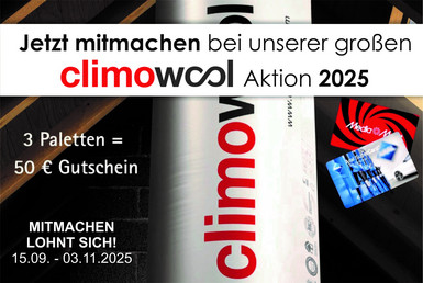 Moderne Glaswoll-Produkte, starke Marke, große Programmtiefe! Auch in diesem Jahr starten wir zusammen mit climowool eine Prämienaktion. Kaufen Sie im Aktionszeitraum einfach bei uns Ihren Bedarf an climowool-Produkten ein. Als Dankeschön erhalten Sie nach Ablauf der Aktion wahlweise 50 €-MediaMarkt- oder 50 €-Aral-Tank-Gutscheine.