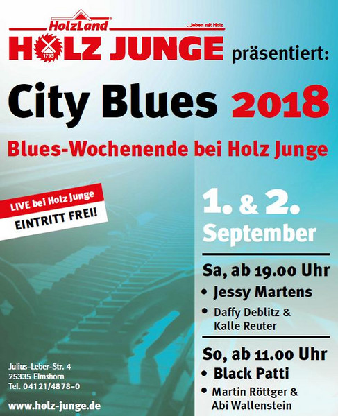 Wir freuen uns schon jetzt auf den 1. und 2. September 2018 denn dann findet das nächste City Blues Wochenende in Elmshorn bei Holz Junge statt. Zwei Tage lang feiern wir mit euch eine entspannte Party und holen dazu wieder herausragende Musiker in unserer schönen, alten Halle. Wer noch kein Ticket hat, für den haben wir gute Nachrichten: Ihr braucht kein Ticket, der Eintritt ist frei!